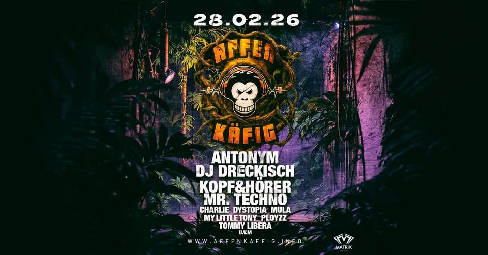 AFFENKÄFIGOrganized by Affenkäfig,Antonym . CHARLIE . DJ Dreckisch . Kopf & Hörer . Mr. Techno . Mula . My Little Tony . Ployzz . Tommy Libera . dystopia . |