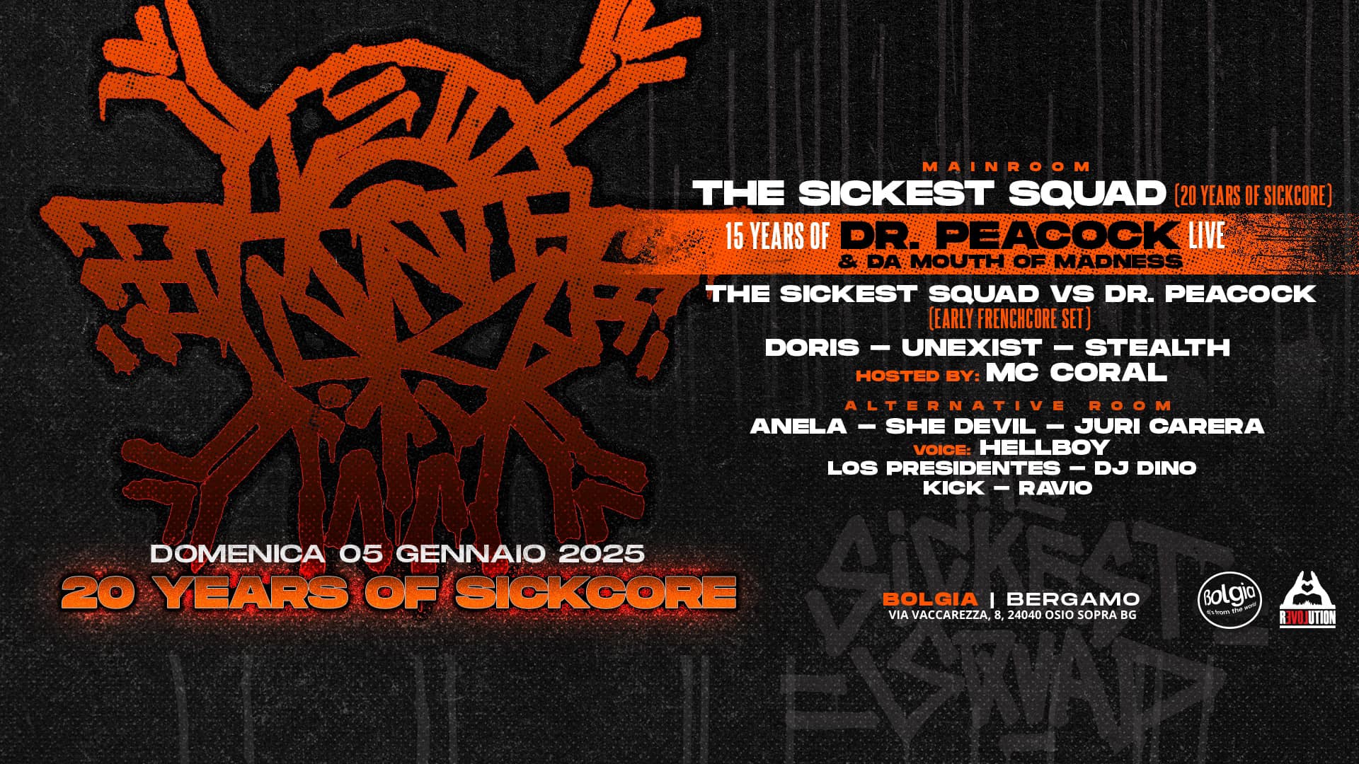 MAIN ROOM: The Sickest Squad Dr.Peacock Live & Da Mouth Of Madness Doris Unexist Stealth Hosted by: Mc Coral ALTERNATIVE ROOM: Anela She Devil Juri Carera voice: Hellboy Los Presidentes Dj Dino Kick Ravio --------------------------- ➡️ VUOI ASSICURARTI L'INGRESSO? Mettiti in Lista: 20€ entro le ore 23:30 25€ entro le ore 01:00 Dopo 28€ Info/Liste 3383624803 Supertato 3287377598 Giorgio Oppure Prenotati Qui Online: https://www.bolgia.it/ck/?pr-code=tato oppure Prenota il Tavolo: -Tavoli => da 1 Bottiglia 100€ -Tavoli Prive/Consolle => 4 Bottiglie 400€ Prenotazioni 3383624803 Supertato 3287377598 Giorgio ------------------------- COME ARRIVARE: Osio Sopra(BERGAMO),via Vaccarezza n8. Autostrada mi/ve uscita Dalmine