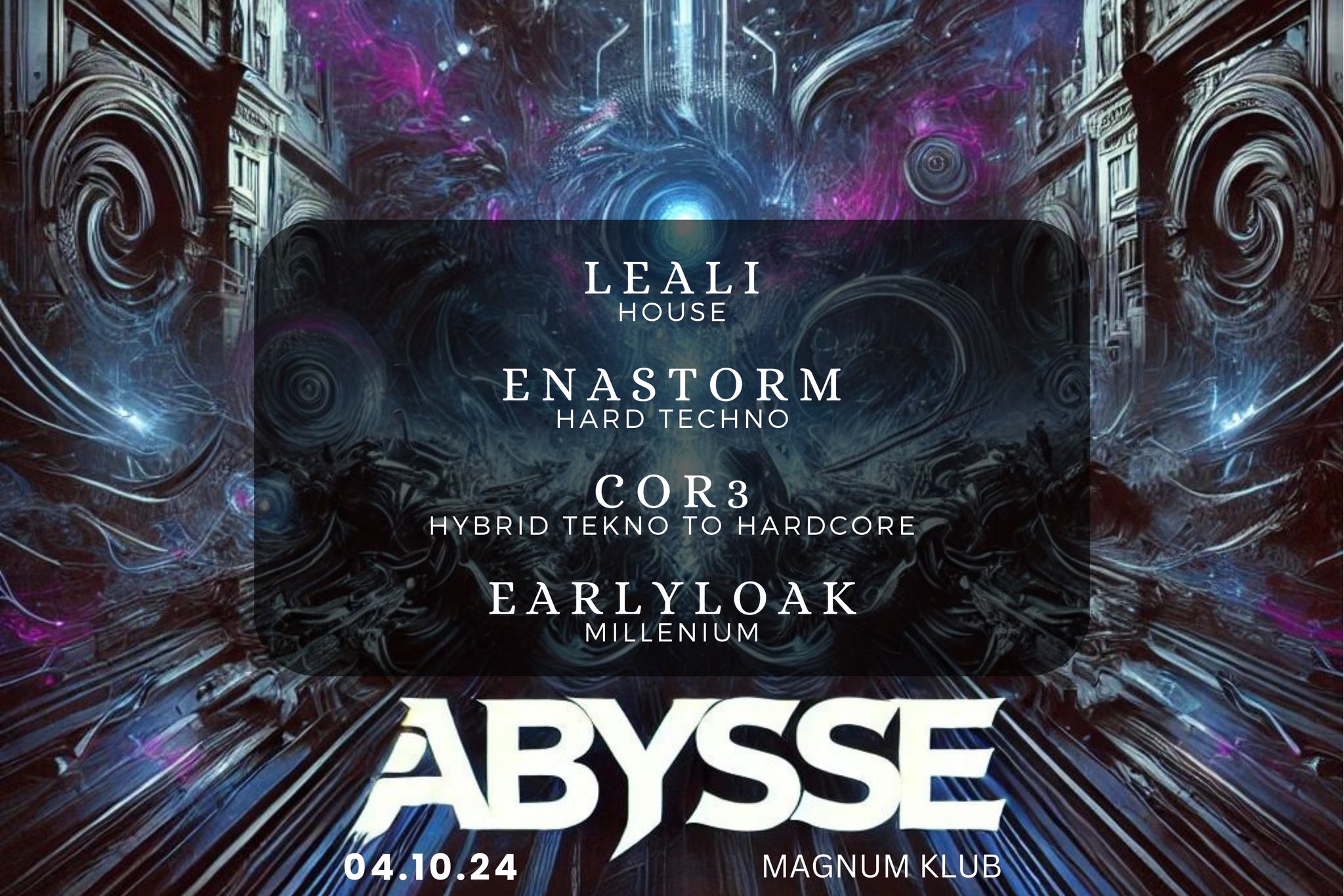 Une nuit inoubliable de musique électronique arrive au Magnum à Paris avec l'événement Abysse. House, Tekno, Acid et Core seront au rendez-vous pour une soirée intense et rythmée jusqu'à l'aube.