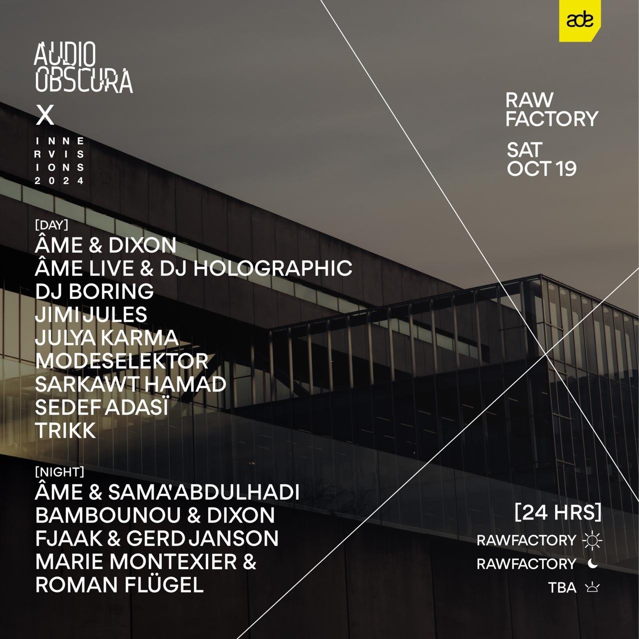 On the Saturday of ADE, we go all-in and dive into an around-the-clock musical journey with Innervisions, featuring artists such as Âme, Dixon, Trikk, Jimi Jules, Marie Montexier, Fjaak, Sedef Adasï, and many more as they push the boundaries of electronic music. This all-day experience includes a daytime and nighttime RAWFACTORY event, finishing off with an extraordinary closing show somewhere in Amsterdam. 𝐋𝐈𝐍𝐄𝐔𝐏 Âme Bambounou Dixon DJ Boring DJ Holographic FJAAK Gerd Janson Jimi Jules Julya Karma Marie Montexier Modeselektor Roman Flügel Sama’abdulhadi Sarkawt Hamad Sedef Adasï Trikk
