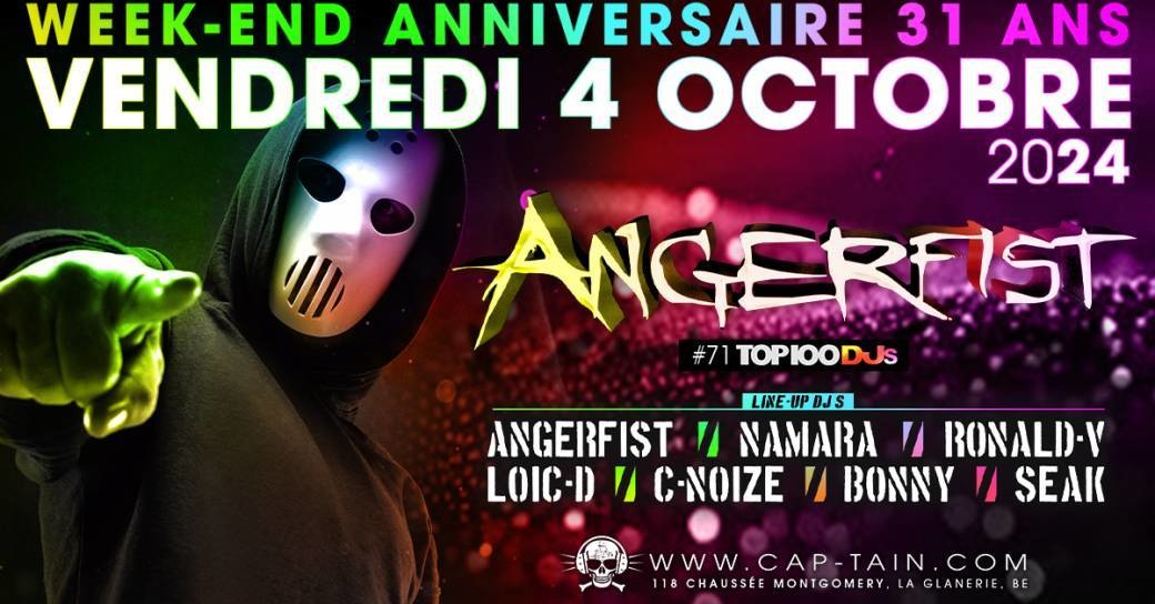 Le DJ hardcore n°1 au monde, ANGERFIST, revient au CAP'TAIN le vendredi 4 octobre 2024 pour marquer la première soirée du week-end anniversaire des 31 ans du complexe. Ne manquez pas également la grande fête d'anniversaire : le MEGA BIRTHDAY du CAP'TAIN, le samedi 5 octobre 2024 🎊🎉🎁