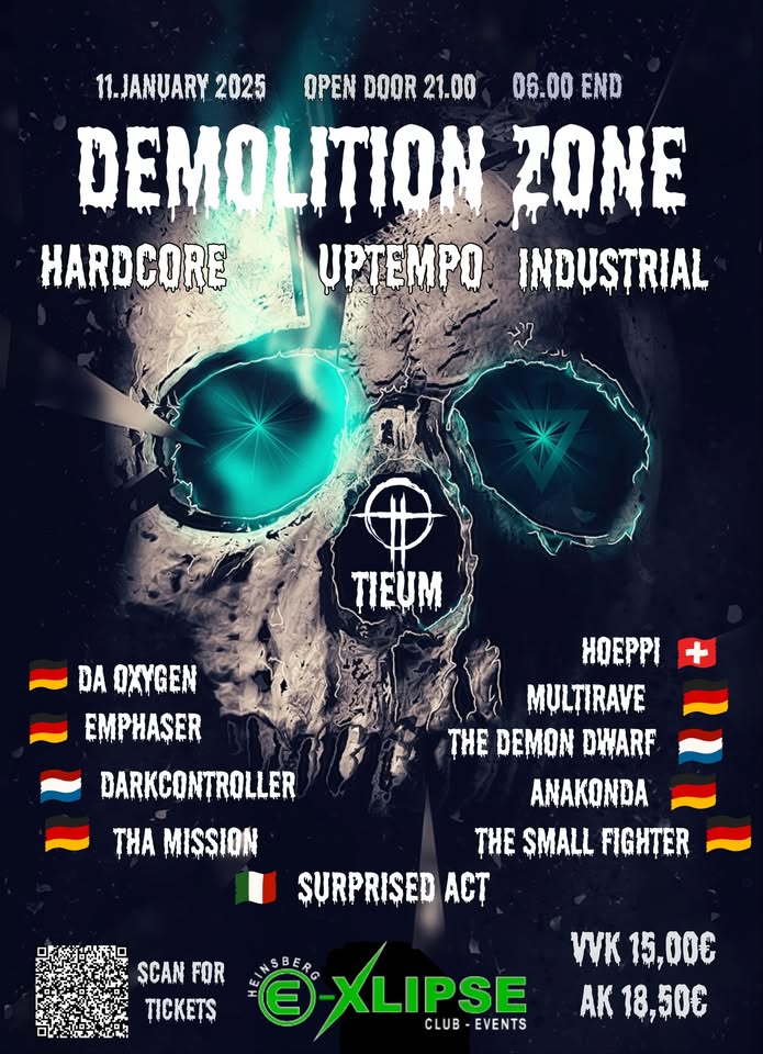 Line up 🎧 🎧 TIEUM 🇫🇷 https://www.facebook.com/DJTieum 🎧 DA OXYGEN 🇩🇪 facebook.com/DaOxyGen 🎧 DARKCONTROLLER 🇳🇱 🎧 HOEPPI 🇨🇭 https://www.facebook.com/Hoeppiofficial 🎧 THE DEMON DWARF 🇳🇱 https://www.facebook.com/DemonDwarf 🎧 EMPHASER 🇩🇪 https://www.facebook.com/EmphaserHardcore 🎧 THA MISSION 🇩🇪 https://www.facebook.com/ThaMission 🎧 MULTIRAVE 🇩🇪 🎧 ANAKONDA 🇩🇪 https://www.facebook.com/xxanakondaxx 🎧 THE SMALL FIGHTER 🇩🇪 https://www.facebook.com/TsFkR 🎧 Surprise Act 🇮🇹