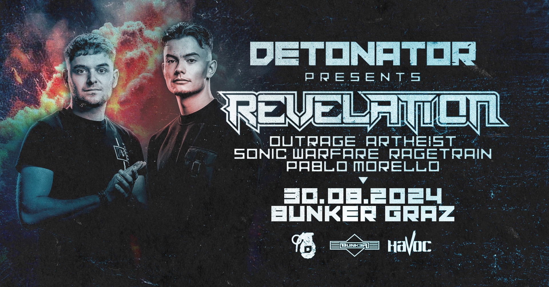 DETONATOR PRES. Revelation Detonator meldet sich mit einem KRACHER zurück in die nächste Runde. Mit Revelation holen wir ein Rawstyle Duo der Extraklasse! Mit ihrem unverwechselbaren Sound werden sie den Bunker in Graz in Schutt und Asche legen! Mit dabei sind unsere Top Locals aus Österreich! ▪️LINE UP: • Revelation (NL) 🇳🇱 ▪️ SUPPORT ► Outrage ► Artheist ► Sonic Warfare ► Ragetrain ► Pablo Morello