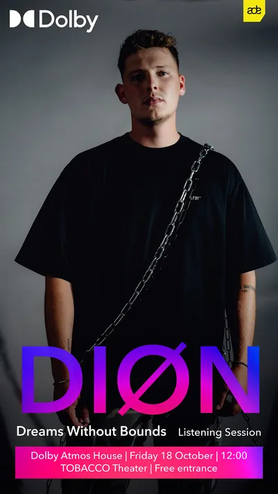 Dolby Atmos House - DIØN - Listening Session Have you ever been immersed in sound that comes from all around you with pinpoint precision and clarity? Step inside our Dolby Atmos House at TOBACCO Theater, where you're joined by the artists and engineers pushing sound to new heights. Located right at the heart of ADE, we'll introduce you to the limitless possibilities of immersive audio with Dolby Atmos. Join us at ADE on Thursday and Friday to experience intimate listening sessions, talks, a live concert, hands-on mixing workshops, and more.