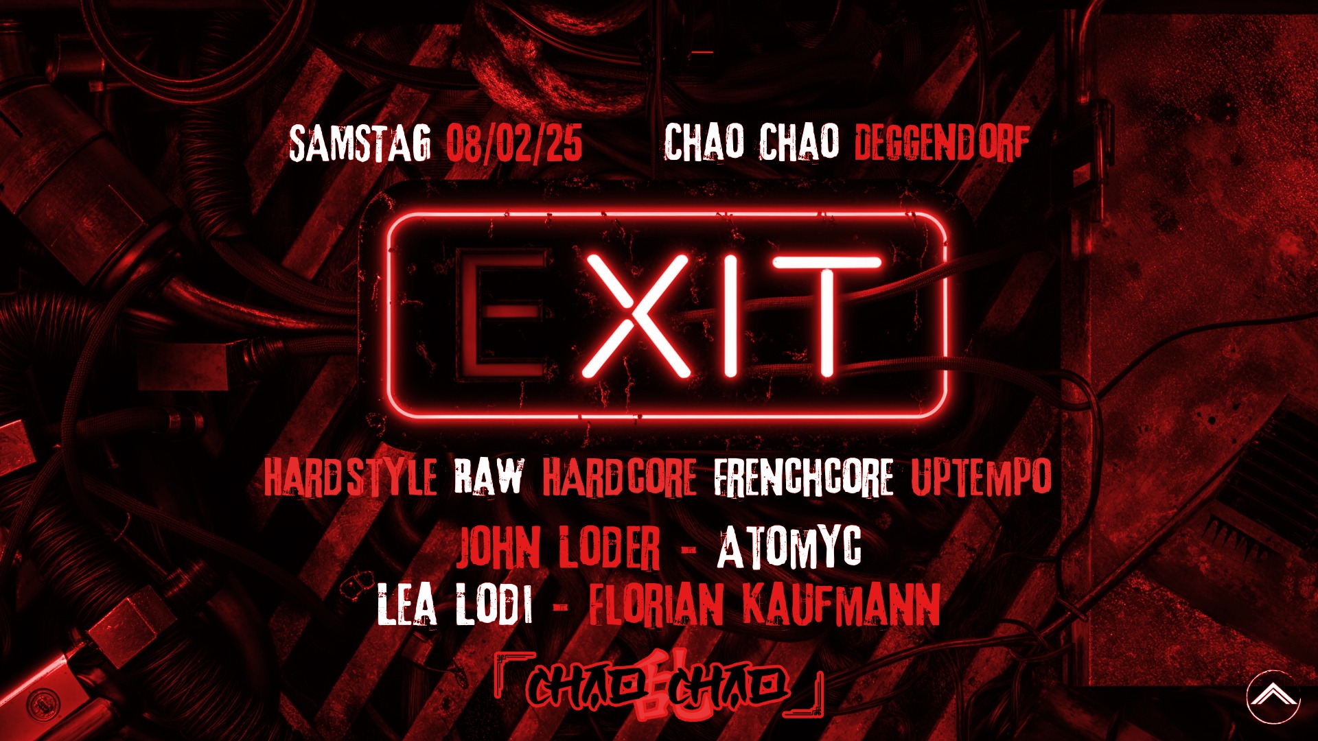 (E)XIT TOUR 2025🚨 🎶Harderstyles-Lovers, aufgepasst!🎶 Es wird laut, es wird wild, es wird unvergesslich – die XIT Clubtour bringt euch auf eine Reise, die euch aus der Realität entführt und direkt in die Welt der härtesten Beats katapultiert! 🔥 📅 Datum: 08.02.2025 📍 Location: Chao Chao Deggendorf ⏰ Start: 23:00 Uhr 🎧 Line-up: • Atomyc @dj_atomyc • John Loder @dj.johnloder • Lea Lodi @djane.lealodi • Florian Kaufmann @_kaufmannflo_ 💵 Kasse: Abendkasse Bereitet euch vor auf einen Abend voller: 💥 Bombastischer Hardstyle-Drops ⚡ Energiegeladener Raw-Kicks 🎶 Epischer Euphoric-Vibes Ob Rawstyle, Hardcore oder Uptempo – bei XIT ist für jeden Harderstyles-Fan etwas dabei. Es ist mehr als nur Musik. Es ist ein Erlebnis, das euch die Sorgen des Alltags vergessen lässt. Escape from Reality! 🌌 🔗 Tickets: 7 Euro 📲 Mehr Infos: Checkt unsere Story oder DM für Details! Lasst uns zusammen die Grenzen der Realität sprengen. Sei dabei und werde Teil von XIT! 🎉