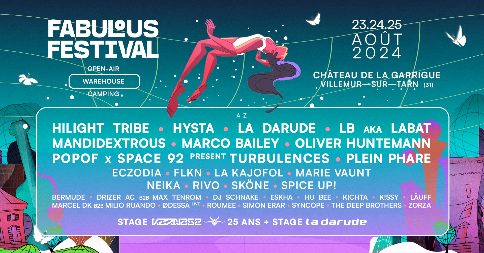 𝐕𝐄𝐍𝐃𝐑𝐄𝐃𝐈𝐓 𝟐𝟑 𝐀𝐎𝐔̂𝐓 ‣ 19h00 à 06h00 𝐒𝐓𝐀𝐆𝐄 𝐇𝐎𝐒𝐓 𝐁𝐘 𝐊𝐀𝐑𝐍𝐀𝐆𝐄 - 𝟐𝟓𝐭𝐡 𝐚𝐧𝐧𝐢𝐯𝐞𝐫𝐬𝐚𝐫𝐲 ⬇️ a-z HILIGHT TRIBE HYSTA LA KAJOFOL MANDIDEXTROUS NEIKA SKÖNE SPICE UP! +local artists K!SSY • ROUMEE • SYNCOPE 𝐒𝐀𝐌𝐄𝐃𝐈 𝟐𝟒 𝐀𝐎𝐔̂𝐓‣ 14h00-07h00 a-z ECZODIA FKLN LB AKA LABAT MARCO BAILEY MARIE VAUNT OLIVER HUNTEMANN RIVO SPACE 92 b2b POPOF PRES. TURBULENCES +local artists BERMUDE • DRIZER AC B2B MAX TENROM • HU BEE MARCEL DK B2B MILIO RUANDO • ØDESSĀ live SIMON ERAR • THE DEEP BROTHERS 𝐃𝐈𝐌𝐀𝐍𝐂𝐇𝐄 𝟐𝟓 𝐀𝐎𝐔̂𝐓 ‣ 14h00 à 22h00 𝐒𝐓𝐀𝐆𝐄 𝐇𝐎𝐒𝐓 𝐁𝐘 𝐋𝐀 𝐃𝐀𝐑𝐔𝐃𝐄 💫 DJ SCHNAKE ESKHA LÄUFF ZORZA +local artist KICHTA 🎟 𝐁𝐈𝐋𝐋𝐄𝐓𝐓𝐄𝐑𝐈𝐄 https://shotgun.live/fr/festivals/fabulous-festival-2024 Uniquement les 'PASS 3 JOURS + CAMPING’ et ‘PASS 2 JOURS + CAMPING’ permettent l’accès au camping Pass Culture : https://bit.ly/passculturefabulous2024 👀 𝐀𝐂𝐂𝐄̀𝐒 Château de la Garrigue 980 Chemin de Pellausy 31340 Villemur-sur-Tarn à seulement 30 minutes du centre de Toulouse Parking gratuit de 600 places à proximité 🤝𝐏𝐀𝐑𝐓𝐄𝐍𝐀𝐈𝐑𝐄𝐒 Château de la Garrigue N Production Electro News Pass Culture Effet Tunnel Plein Phare Karnage