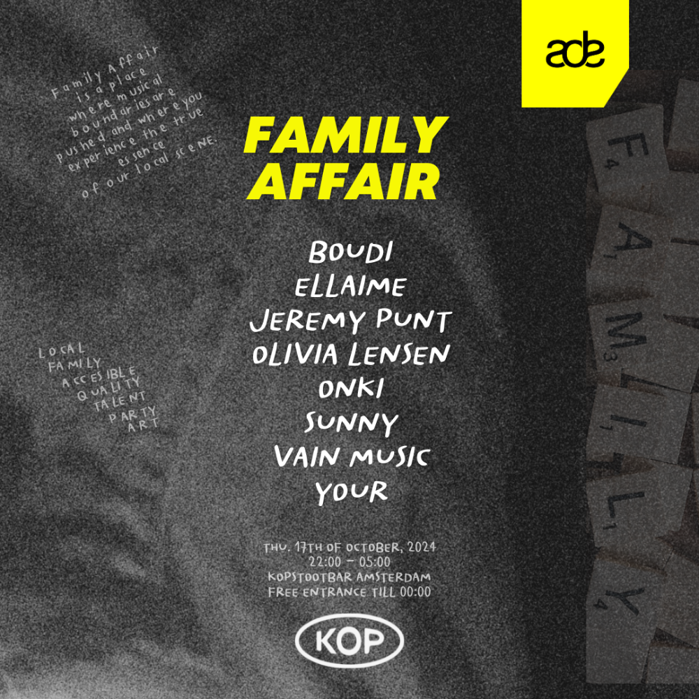 During ADE, we proudly present "Family Affair" at the iconic Kopstootbar. This event brings together the best and most promising artists from the Dutch dance scène for an unforgettable, musical and energetic night where we lay focus on our locals!