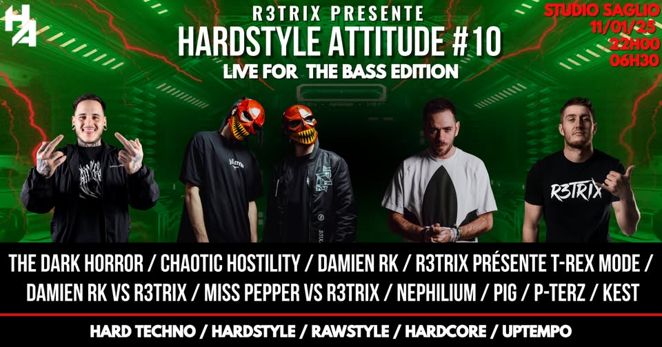 🦖 R3TRIX Présente : HARDSTYLE ATTITUDE #10 (Live For The Bass Edition) avec THE DARK HORROR / CHAOTIC HOSTILITY / DAMIEN RK / R3TRIX & MORE 🚨 Après une édition 9 riche en souvenirs, il est temps de fêter la 10ème édition comme il se doit ! Pour fêter ça le mieux possible il a fallu concocter une line up composée d’artistes que vous nous avez énormément demandé et de vos têtes locales ou françaises préférées. ▀▀▀▀▀▀ ▀▀▀▀▀▀ ▀▀▀▀▀▀ 💀 LINE UP THE DARK HORROR (Uptempo) 🇧🇪 CHAOTIC HOSTILITY (Uptempo) 🇳🇱 DAMIEN RK (Hard Music) 🇫🇷 R3TRIX Présente T-REX MODE (Extra Raw/Rawtempo) 🇫🇷 DAMIEN RK VS R3TRIX🇫🇷 (Hard Music) MISS PEPPER VS R3TRIX 🇫🇷 (Extra Raw) NEPHILIUM 🇫🇷 (Hardcore) PIG 🇫🇷 (Hardstyle) P-TERZ 🇫🇷 (Hardstyle/Raw) KEST 🇫🇷 (Hard Techno) TIME TABLE : à venir ▀▀▀▀▀▀ ▀▀▀▀▀▀ ▀▀▀▀▀▀ ⏳ Samedi 11 janvier 2025 ⏱️ 22H00 / 06H30 📍STUDIO SAGLIO (16 rue Saglio 67100 Strasbourg) ▀▀▀▀▀▀ ▀▀▀▀▀▀ ▀▀▀▀▀▀ 🎫 BILLETTERIE Préventes : https://shotgun.live/.../r-3-trix-presente-hardstyle... TARIF 1 : 13,50€ (frais Shotgun compris) TARIF 2 : 16,50€ (frais Shotgun compris) TARIF 3 : 18,50 frais Shotgun compris) Sur place : 20€ ▀▀▀▀▀▀ ▀▀▀▀▀▀ ▀▀▀▀▀▀ ⚠️ INFORMATIONS SUPPLÉMENTAIRES ⚠️ 👜 Vestiaire : - Sac : 4€ (Dépôt obligatoire) - Manteau, vestes... etc : 2€ (Dépôt recommandé) 👕 VENEZ COMME VOUS ÊTES : toutes les tenues vestimentaires sont acceptées 🔞 Événement interdit aux mineurs 👨✈️ La direction se réserve le droit d'accès à l'établissement Voir moins Strasbourg