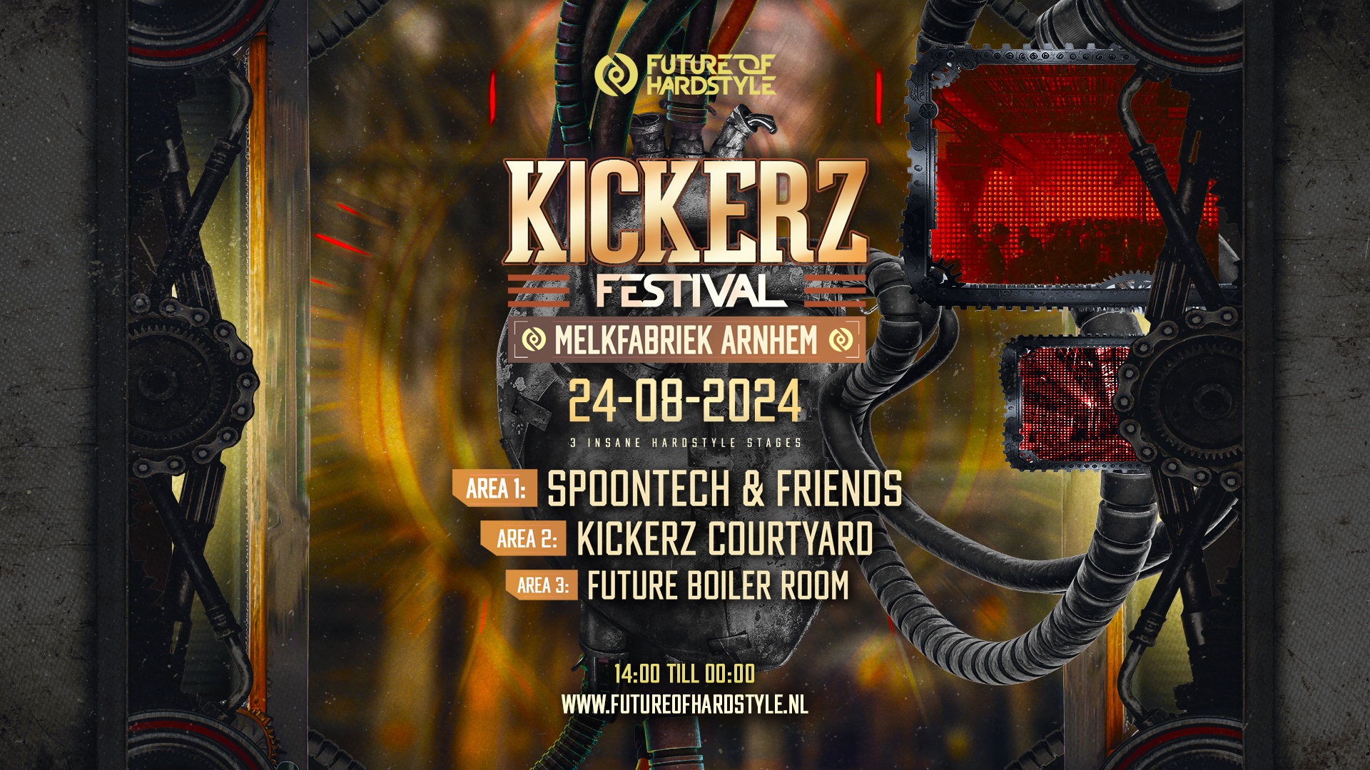 𝐊𝐢𝐜𝐤𝐞𝐫𝐳 𝐅𝐞𝐬𝐭𝐢𝐯𝐚𝐥! On the 24th of August we will create a once in a lifetime experience during the first ever Kickerz Festival! Bringing you a Spoontech & Friends mainstage, the Kickerz Courtyard and a Future Boiler Room, we assure you one of the most diverse line-ups you have seen in a while, all at the industrial grounds of the legendary Melkfabriek in Arnhem! Grab your tickets now before it’s too late! 𝗔𝗿𝗲𝗮 𝟭: 𝗦𝗽𝗼𝗼𝗻𝘁𝗲𝗰𝗵 & 𝗙𝗿𝗶𝗲𝗻𝗱𝘀 Amduscias Chapter V Collusion D-Verze [Spoon classics] Element Faceless Infliction Luminite Mortis Omnya Phantom Posyden Rallen [SpoonTechno] Repeller Valido Vyral [SpoonTechno] Host: MC Barricade