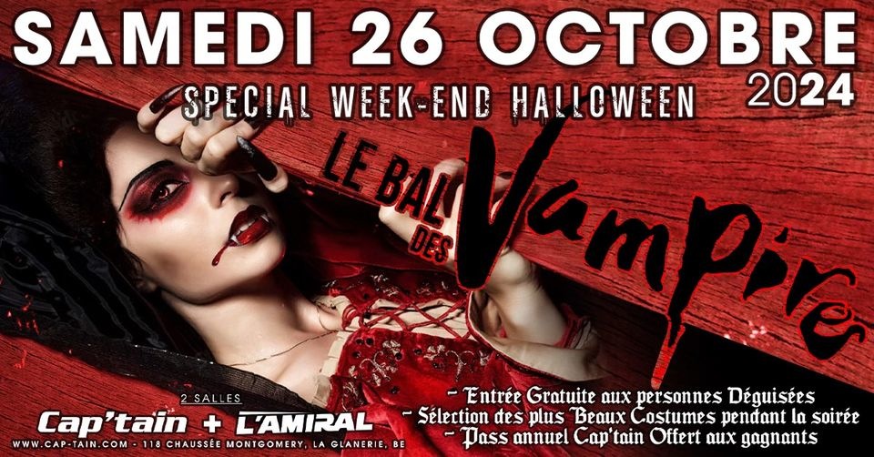 SAMEDI 26 OCTOBRE 2024 ▶️ LE BAL DES VAMPIRES 🎃 SPECIAL WEEK-END HALLOWEEN 🎃 🧛♀️ ENTRÉE GRATUITE AUX PERSONNES DÉGUISÉES* 🧛♀️ SÉLECTION DES PLUS BEAUX COSTUMES PENDANT LA SOIRÉE 🧛♀️ 1 PASS ANNUEL CAP’TAIN OFFERT AUX GAGNANTS 🎧 LINE UP DJ’s ❌ CAP'TAIN [Room1] 🔊 RONALD-V 🔊 LOIC-D 🔊 C-NOIZE 🔊 BONNY 🔊 SEAK (Final Hardcore) ❌ à L'AMIRAL [Room 2] 🔊 AKLIX 🔊 LIL STEEVE ❌❌ TARIF : 15€ ❌❌ - *Gratuit pour les personnes entièrement déguisées. ⚠️ Entrée gratuite dans la compilation CAP'TAIN 31 YEARS valable pour cette soirée. (Vente sur place uniquement - Pas de prévente) Accès à tout le COMPLEXE ▬▬▬▬▬▬▬▬▬ 🔴 OUVERTURE À 22.00 🔴 ÂGE MINIMUM : 16 ANS 🔴 PARKING GRATUIT 🔴 VESTIAIRE GRATUIT 🔴 TOILETTES GRATUITES 🔴 2 ESPACES FUMEURS ▬▬▬▬▬▬▬▬▬ TOUTES LES PROCHAINES SOIRÉES ▶️ http://www.cap-tain.com/agenda SITE INTERNET ▶️ http://www.cap-tain.com/ FACEBOOK OFFICIEL ▶️ http://www.facebook.com/complexecaptain SNAPCHAT ▶️ captainofficial INSTAGRAM ▶️ http://www.instagram.com/complexecaptain YOUTUBE CAP'TAIN TV ▶️ http://www.youtube.com/CaptainOfficial SOUNDCLOUD ▶️ https://soundcloud.com/complexe-captain/ EM@IL ▶️ captain1993.contact@gmail.com COMPLEXE CAP'TAIN 118 chaussée Montgomery 7611 LA GLANERIE (BELGIUM)