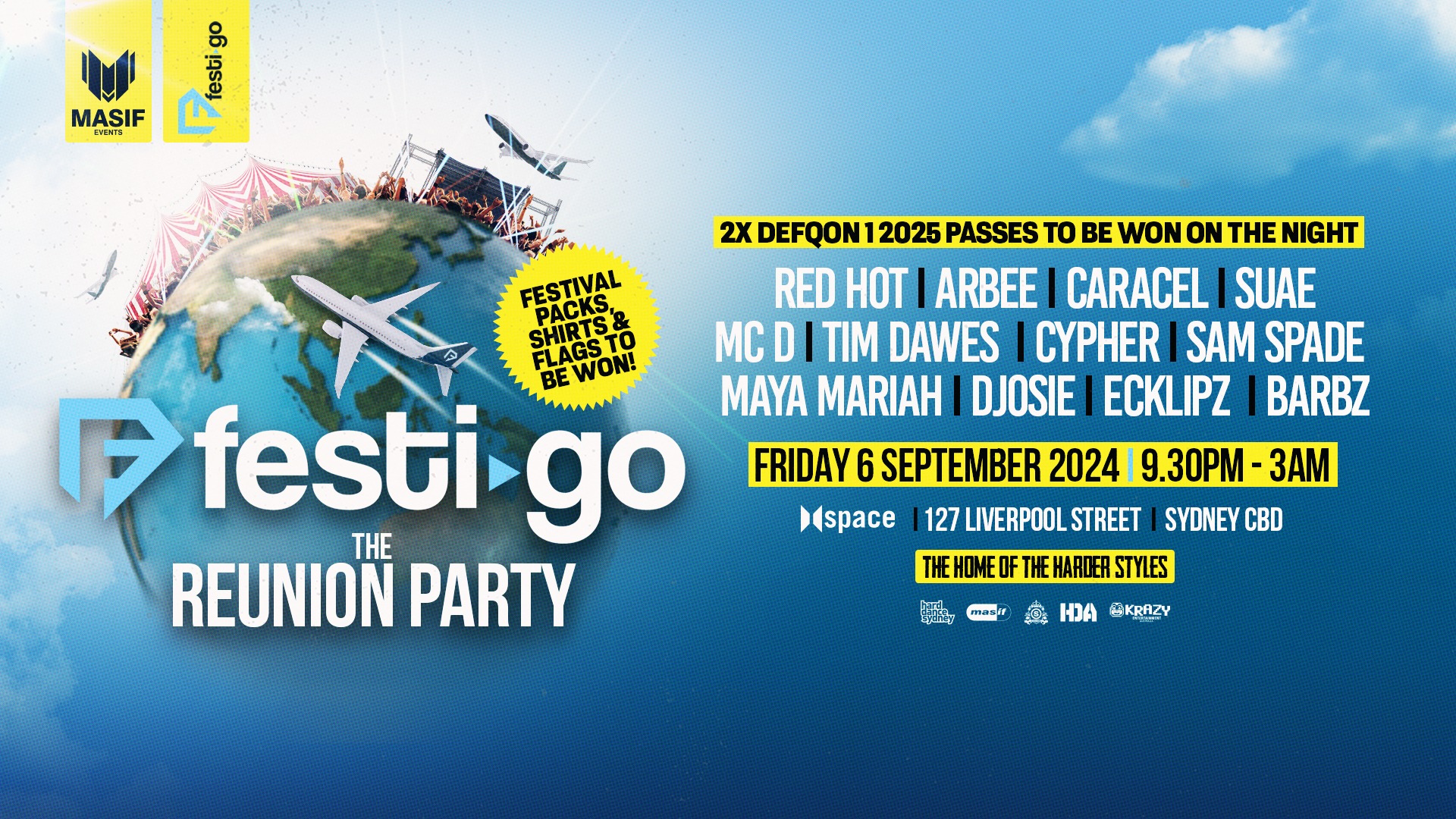 BUY TIX HERE: fanlink.tv/masiftix MASIF teams up with the FESTIGO crew to celebrate the return of the gang from their European Festival tours! A great night to catch up, swap stories, hakk away, and be in to win loads of prizes including 2 tickets to Defqon 1 2025!!! Got to be there to be in to win it! See YOU at the HOME OF THE HARDER STYLES on Friday, September 6th! LINEUP: RED HOT ARBEE CARACEL SUAE MC D TIM DAWES CYPHER SAM SPADE MAYA DJ OSIE ECKLIPZ BARBZ "Because everything is MASIF...so is FESTIGO reunions...and so are YOU!" TICKET INFO: - ONLINE TICKETS via TICKETBOOTH are $25+bf at: fanlink.tv/masiftix - NO name changes on tickets. - Maximum 8 tickets per transaction. - Name must match valid Government approved ID on the door. BOOTH BOOKINGS: Please message the MASIF EVENTS Facebook page for GROUP or BOOTH bookings! SPACE DRESS CODE: No track pants or trackies. Tights are OK. No drawstring type shorts. (Shorts must have belt loops and be of the dressier kind). No singlets. No hats. If in doubt, we recommend you make a little more effort. The dress code isn't strict but there are limits. Don't miss out on a great night out because you look too casual. * Management reserves the right to refuse entry. ================================================= FACEBOOK: Masif Events Masif GVNG Hard Dance Sydney