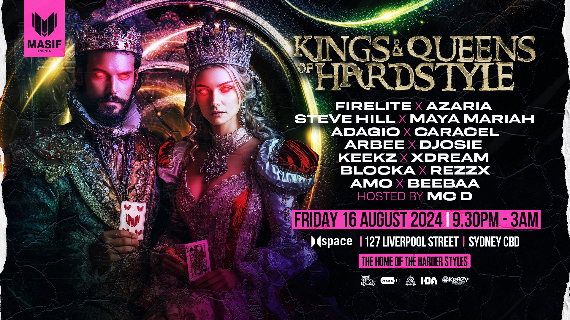 BUY TICKETS HERE: fanlink.tv/masiftix MASIF present the KINGS & QUEENS of HARDSTYLE in SYDNEY on Friday, August 16th! All the colours of the Hardstylew rainbow are repsented at this epic event at the HOME OF THE HARDER STYLES! See YOU on the dancefloor... MASIF ARENA: FIRELITE x AZARIA STEVE HILL x MAYA MARIAH ADAGIO x CARACEL KEEKZ x XDREAM ARBEE x DJOSIE BLOCKA x REZZX AMO x BEEBAA Hosted by: MC D "Because everything is MASIF...so are the KINGS & QUEENS of the local scene...and so are YOU!" TICKET INFO: - ONLINE TICKETS via TICKETBOOTH are from $25+bf at: fanlink.tv/masiftix - NO name changes on tickets. - Maximum 8 tickets per transaction. - Name must match valid Government approved ID on the door. BOOTH BOOKINGS: Please message the MASIF EVENTS Facebook page for GROUP or BOOTH bookings! SPACE DRESS CODE: No track pants or trackies. Tights are OK. No drawstring type shorts. (Shorts must have belt loops and be of the dressier kind). No singlets. No hats. If in doubt, we recommend you make a little more effort. The dress code isn't strict but there are limits. Don't miss out on a great night out because you look too casual. * Management reserves the right to refuse entry. ================================================= FACEBOOK: Masif Events Masif GVNG Hard Dance Sydney