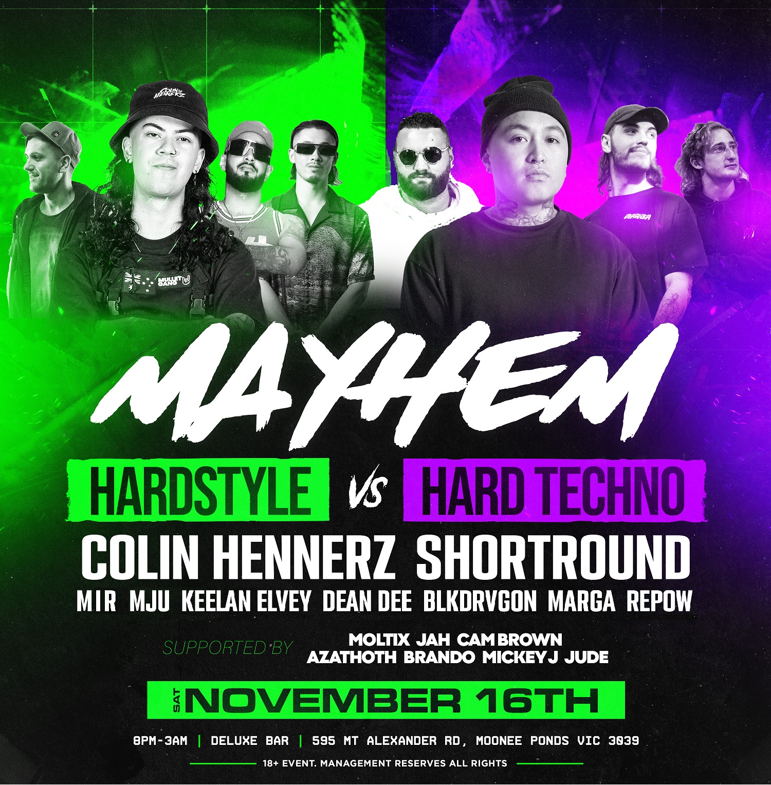 MAYHEM. November 16, we're going to bring absolute MAYHEM to Melbourne. GET READY for unrestricted insanity with the biggest battle of the genres. 3 Levels, 3 Stages, Genres Clashing, take your pick, take your level, because we're bringing MAYHEM. LEVEL 1 - Hard Techno (Boiler Room) SHORTROUND, MARGA, Keelan Elvey, Repow, Teos Papa, Cam Brown, Jah, Azathoth LEVEL 2 - Hardstyle Rave COLIN HENNERZ, DEAN DEE, MJU, MIR, BLKDRGN, MOLTIX, Dong Dam LEVEL 3 - Rooftop House Brando, Mickey J, Jude Come join us for the Ultimate Genre Clash Experience! 9PM-LATE IMPORTANT DATES Mayhem Presales Release - $25 - Open until exhaustion from Oct 2 7:00PM General Public Sale - Open After Presales are complete Get your Tickets Early as we cannot guarantee Door Sales with capacity restrictions on tickets! With Link Entertainment's Last Event 'Hardstyle Rave' Door Sales were exhausted before 10PM. Limited numbers so get them fast! Please beware of Scammers on Facebook, all our tickets are sold via LINK ENTERTAINMENT on EVENTBRITE. If you have any doubts or need assurance, do not hesitate to contact us, our staff will try their best to sort it out. 18+ Event. Management Reserves All Rights.