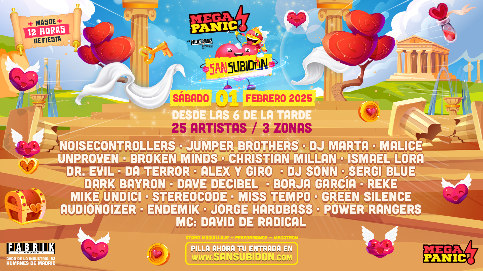 Descripción ¡Megapanic vuelve para hacerte vibrar de amor en Fabrik este 1 de Febrero! ¡Celebra San Subidón con nosotros! Una cita donde la música será la verdadera flecha de Cupido. Con 25 DJs, más de 12 horas de fiesta y tres áreas llenas de pasión, prepárate para enamorarte de una noche inolvidable. En el cartel, auténticos "rompecorazones" como Noisecontrollers, Malice y Unproven, junto a leyendas del remember nacional como Jumper Brothers, Dj Marta y Miguel Serna. ¡El amor está en el aire, y el ritmo en tus pies! ¡Consigue tus entradas para Fabrik presenta Megapanic San Subidón, Madrid!