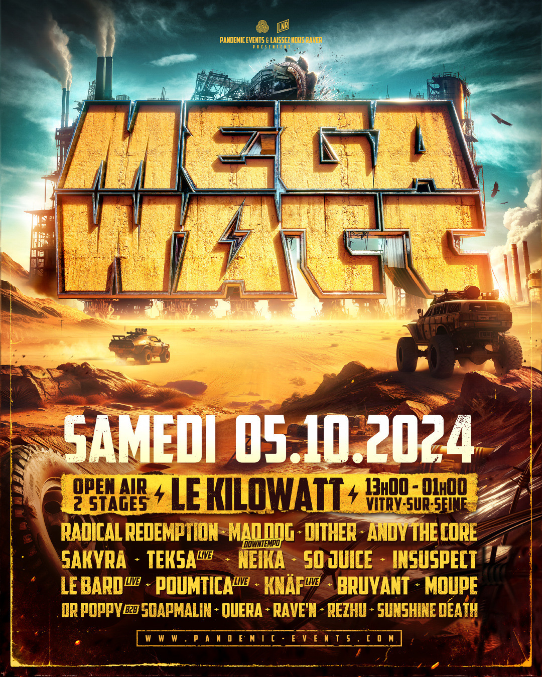PANDEMIC EVENTS et LAISSEZ NOUS RAVER présentent MEGAWATT, un open air exceptionnel avec plus de 18 artistes sur deux scènes au Kilowatt, une ancienne friche industrielle près de Paris. Préparez-vous pour 12 heures de son intense : Hard Techno, Neorave, Raw, Hardcore et Uptempo ⚡️