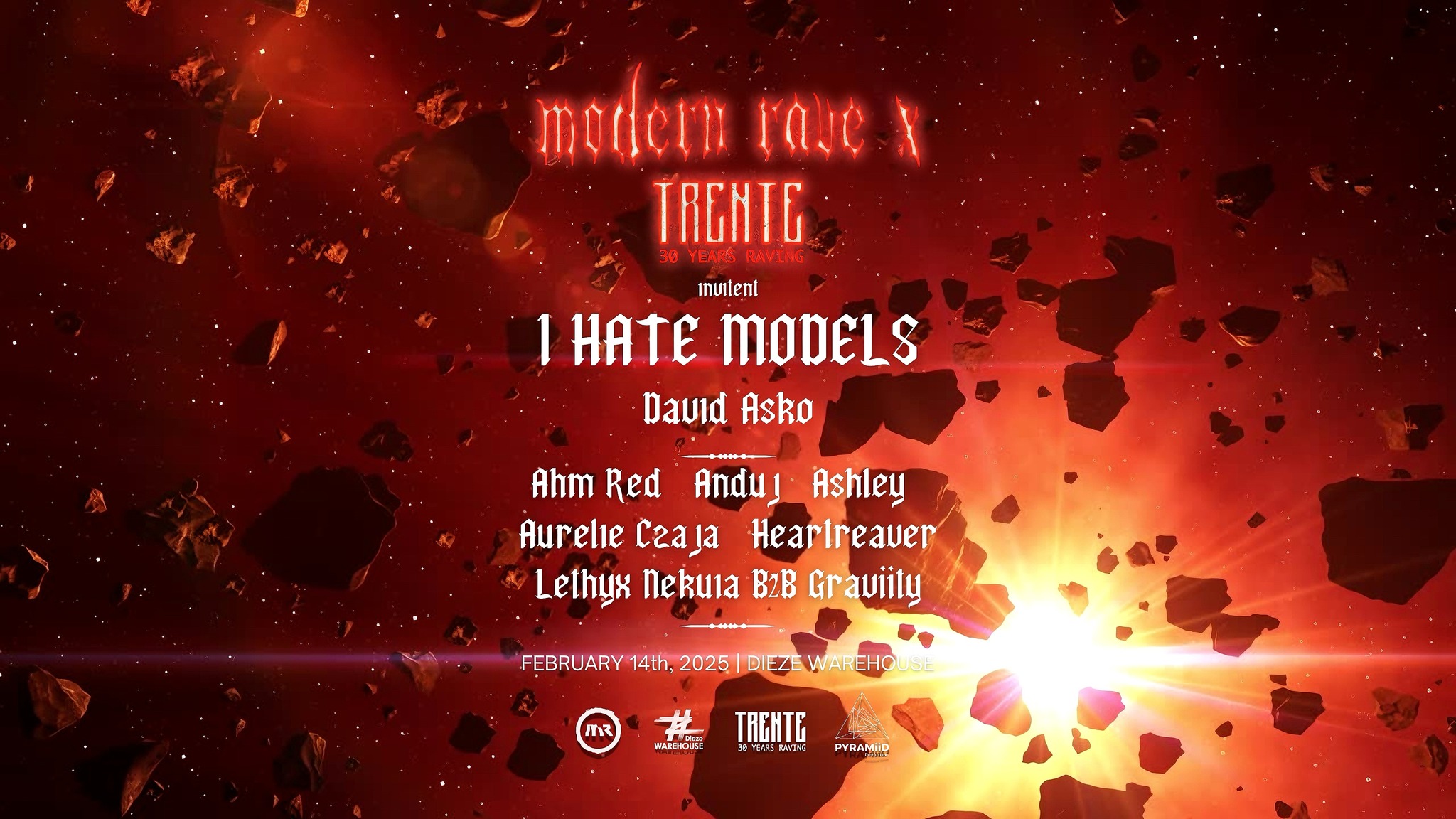 Modern Rave et Pyramiid Production, présentent David Asko TRENTE Tour et invitent pour l’occasion le dj producteur français, véritable phénomène et icône de la musique électronique mondiale : I HATE MODELS ! Préventes : https://shotgun.live/.../modern-rave-x-trente-montpellier... ▬▬▬▬▬▬▬▬▬▬▬▬▬▬▬▬▬▬ 👤 LINE UP : ROOM 1 (23h - 07h) : I Hate Models David Asko Ashley Ahm Red GRAViiTY b2b Lethyx Nekuia ROOM 2 (00h - 06h) : Aurelie Czaja Heartreaver Anduj ▬▬▬▬▬▬▬▬▬▬▬▬▬▬▬▬▬▬ ℹ INFOS PRATIQUES : •VEND 14 FÉVRIER •23:00 - 07:00 •2 ROOMS Dieze Warehouse 188 avenue du Marché Gare 34000 Montpellier