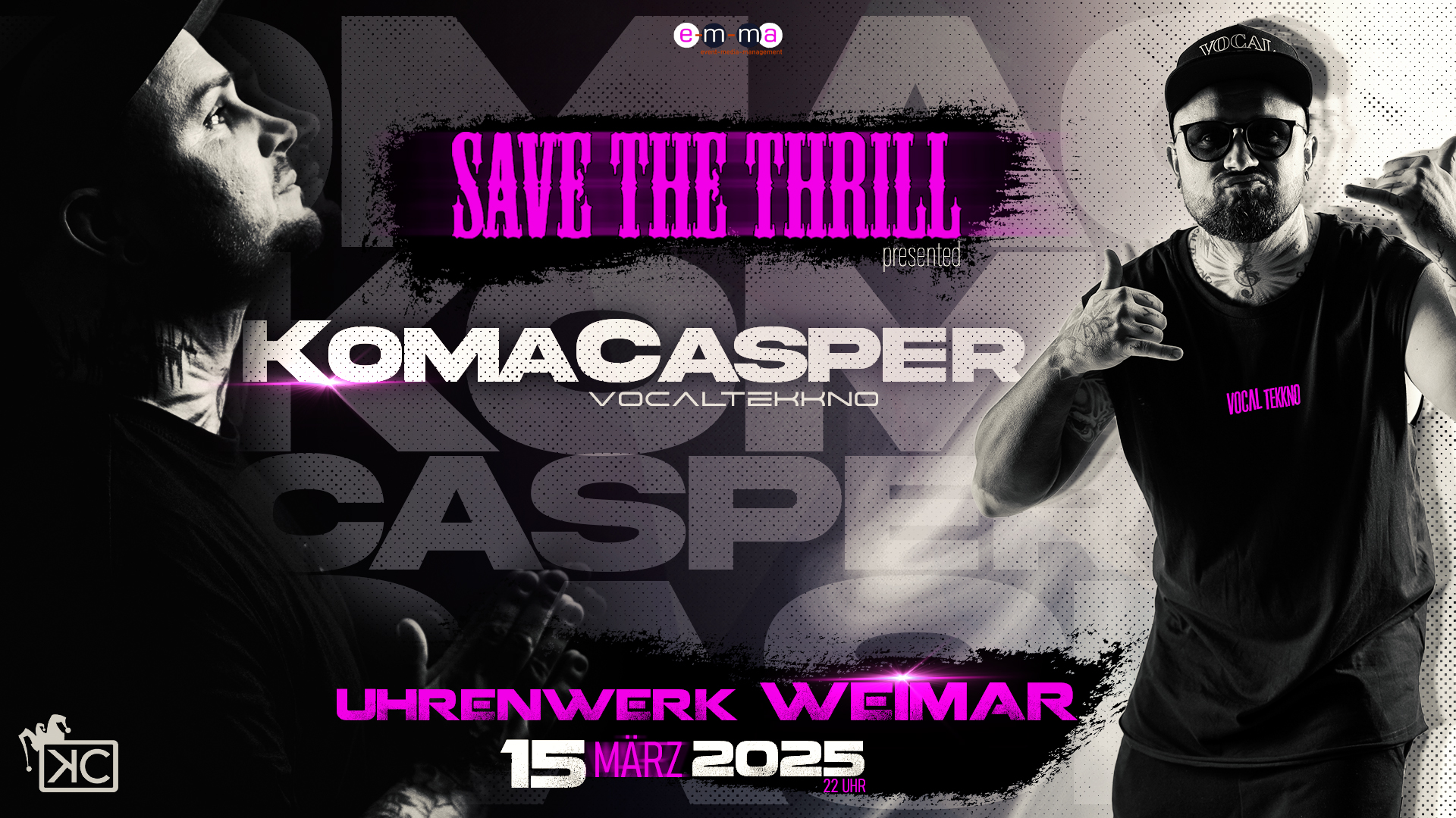 Am 15.03. präsentiert euch SAVE THE THRILL im Uhrenwerk Weimar ein Techno Gewitter der Extraklasse. Macht euch gefasst auf ein fettes Line up mit einem der angesagtesten Headlinern des Landes. Dunkel, straight forward oder „ins Gesicht“. So kann man den KOMACASPER wohl am besten beschreiben. Vocaltekkno - so nennt er sein Genre. Weird? Ja vielleicht ein bisschen. Aber so setzt er seit 2011 Akzente, tritt den Ravern entschlossen entgegen und bringt fette Beats & melodic Parts auf die Dancefloors. Jenseits der gängigen 150 BPM, um genau zu sein 170, haut er die schellen Beats, dicken Subs und aggressiven Drums für Qualität in Sound & Ambiente mitten auf die Tanzfläche. Direkt in die Gesichter der Tekk-Liebhaber, Newbees & Skeptiker. Er holt weit aus und schlägt ein wie ein F16-Kampfjet, mitten im Techno-Urwald. Unerwartet, kompromisslos, bereit alle Gäste zu überzeugen. Aus dem Herzen des Ostens, direkt IN YOUR FACE! Seid dafür auch bereit? KOMACASPER - TEKKNO FOR YOU 🔊 LINEUP 🔊 🔥 KOMACASPER | Vocaltekkno 🔥 xxx 🔥 xxx 🔥 xxx 🎟 TICKETS 🎟 https://www.tixforgigs.com/Event/59466 ℹ️ INFOS ℹ️ ・ Datum: Samstag 15.03.2025 ・ EINLASS AB 22 Uhr ・ P16 (Mit Muttizettel)