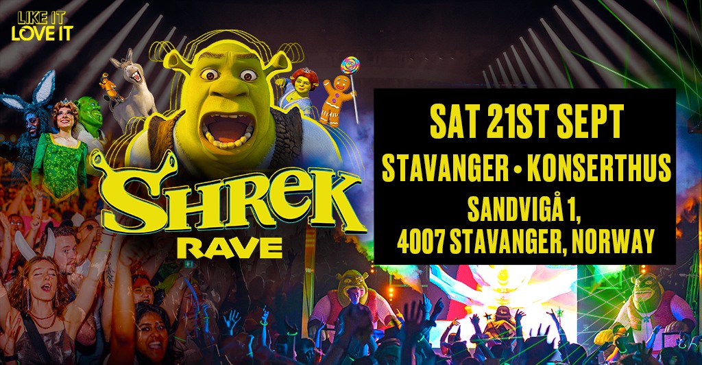 SHREK RAVE HEADING TO STAVANGER! Get ready to party in the swamp at SHREK RAVE! DJs will be spinning Shrek tunes and party anthems all night long to unleash your inner ogre! Expect a Shrek DJ set, wild Shrek performers, "I’m A Believer" singalongs, Shrek visuals, giveaways, and themed drinks. Location: Konserthus Time: 7pm - 1am Date: 21st September 18+ Dress code: GREEN or your favorite Shrek character – the best Shrek-inspired outfit will win a prize! This event is Shrek-inspired and not affiliated with the official copyright. For any questions, contact reservations@shrekraveofficial.com (include Event Name, Date, Location, Full Name, and Order Number if you're an existing customer). Expect a response within 48 hours (excluding weekends and public holidays).