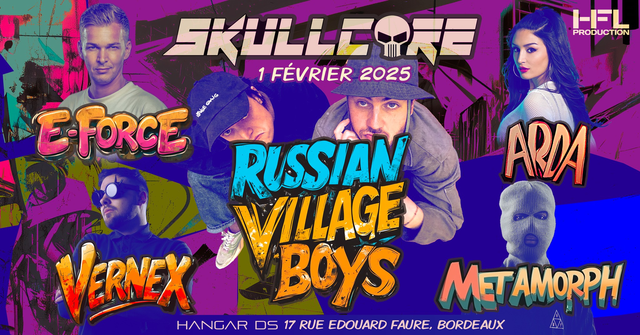 SKULLCORE w/ RUSSIAN VILLAGE BOYS - E-FORCE - VERNEX - ARDA - METAMORPH HANGAR DS – 17 rue Edouard Faure - Bordeaux 00h00 - 06H30 𝗧𝗶𝗰𝗸𝗲𝘁𝘀 : Prévente en ligne https://bit.ly/40w9dpv Early : 12€ + frais de loc PHASE 1 : 15€ + frais de loc PHASE 2 : 17€ + frais de loc _______________________ 𝗟𝗜𝗡𝗘-𝗨𝗣 𝗔𝗥𝗧𝗜𝗦𝗧𝗘𝗦 RUSSIAN VILLAGE BOYS https://www.instagram.com/rvbofficial/?hl=fr https://russianvillageboys.com/ E-FORCE https://www.instagram.com/eforcenl/?hl=fr https://soundcloud.com/eforcenl VERNEX https://www.instagram.com/iamvernex/?hl=fr https://soundcloud.com/djvernex ARDA https://www.instagram.com/arda.music/?hl=fr METAMORPH https://www.instagram.com/metamorphdj_/?hl=fr https://soundcloud.com/metamorphdj _____________________ 𝗜𝗡𝗙𝗢𝗟𝗜𝗡𝗘 : 07 69 33 20 17 _______________________ 𝗜𝗡𝗙𝗢𝗦 𝗘𝗧 𝗔𝗖𝗖𝗘̀𝗦 𝗔𝗖𝗖𝗘̀𝗦 Accès transport en commun : TRAM B Arrêt : Terminus BERGES DE LA GARONNE 𝗜𝗡𝗙𝗢𝗦 - Aucun produit liquide n'est autorisé - Vestiaire - Terrasse plein air - Présence d'agents de sûreté - Veuillez respecter le site ainsi que les règles de bienséance - Si tu te sens mal à l’aise, menacé.e, harcelé.e ou si tu observes quelque chose que tu estimes ne pas être à sa place dans cet endroit et à ce moment précis : n’hésite pas à t’adresser au staff. 𝗔𝗖𝗖𝗘̀𝗦 𝗗𝗘𝗦 𝗠𝗜𝗡𝗘𝗨𝗥𝗦 Les mineurs de moins de 16 ans ne seront pas admis à la manifestation.