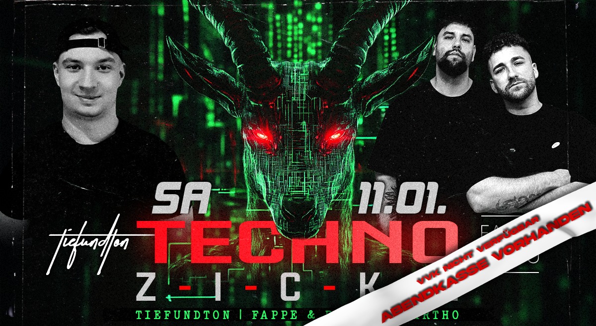 ❗️VVK nicht mehr verfügbar - Abendkasse für 10€ vorhanden❗️ 🐐⛓️ TECHNO ZICKE ⛓️🐐 ⚙️ TiefundTon & Fappe&Bru LIVE! ⚙️ Die heiligen Hallen der Wilden Zicke rufen zum Jahresstart wieder zum ultimativen Rave – es ist Zeit für die Techno Zicke! Dieses Mal bringen euch TiefundTon und Fappe&Bru mit brachialen Beats und hypnotischen Klängen an eure Grenzen!🥵⚡️ TiefundTon ist ein wahrer Meister des treibenden Techno. In der deutschen und internationalen Techno-Szene hat er sich mit seinen energetischen Sets als feste Größe etabliert!⛓️ Fappe&Bru das DJ & Producer Duo aus Gelsenkirchen stehen für melodischen Power-Techno! Mit zahlreichen Auftritten in Clubs und auf Festivals haben sie sich einen Namen gemacht. 🔥☄️ Unterstützt werden die beiden von unserem Resident El Bartho! 🥵😮💨 ▬▬▬ 🎧 LINE UP 🎧 ▬▬▬ 🔊 MAINFLOOR 🔊 Techno, Melodic, Tekk, Hardtechno, Dance, Rave, EDM ► TiefundTon ► Fappe & Bru ► El Bartho 💃🏼 OLDI-FLOOR 🕺🏻 80s, 90s, Schlager ► DJ Patrick ▬▬▬ 🎟️ TICKETS 🎟️ ▬▬▬ ❗️VVK nicht mehr verfügbar - Abendkasse für 10€ vorhanden❗️ 🎫 Online Vorverkauf 🎫 https://wilde-zicke.club/tickets ► 8€ (zzgl. VVK-Gebühr) ► Sicherer Einlass ✅ ► Fast Lane Eingang 🚀 Abendkasse: ► 10€ ▬▬▬ 📆 WANN & WO? 📆 ▬▬▬ 🗓️ SA, 11.01.2025 ⏰ 21:00 - 4:00 Uhr ⏰ 📍 Wilde Zicke, Egeln