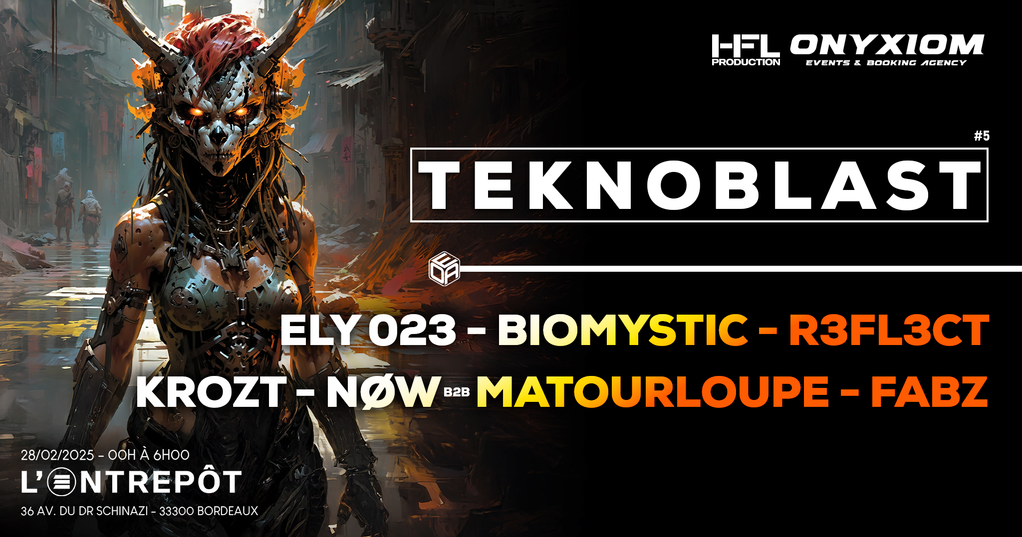 VEN 28.02.2025 TEKNOBLAST ONYXIUM & HFL vous donne rdv pour cette nouvelle collaboration ! Une explosion d'énergie et rafale de son comme vous aimez !! w/ ELY 023 / BIOMYSTIC / R3FL3CT / KROZT / FABZ / NØW B2B MATOURLOUPE L'Entrepôt Club - 36 Av. du Dr Schinazi, Bordeaux 00h00 - 06H00 𝗧𝗶𝗰𝗸𝗲𝘁𝘀 : https://bit.ly/42mGDrY Prévente en ligne EARLY : 8€ + frais de loc. PHASE 1 : 10€ + frais de loc. PHASE 2 : 12€ +frais de loc. _______________________ 𝗟𝗜𝗡𝗘-𝗨𝗣 𝗔𝗥𝗧𝗜𝗦𝗧𝗘𝗦 ELY 023 https://www.instagram.com/ely_023_/ https://soundcloud.com/ely023