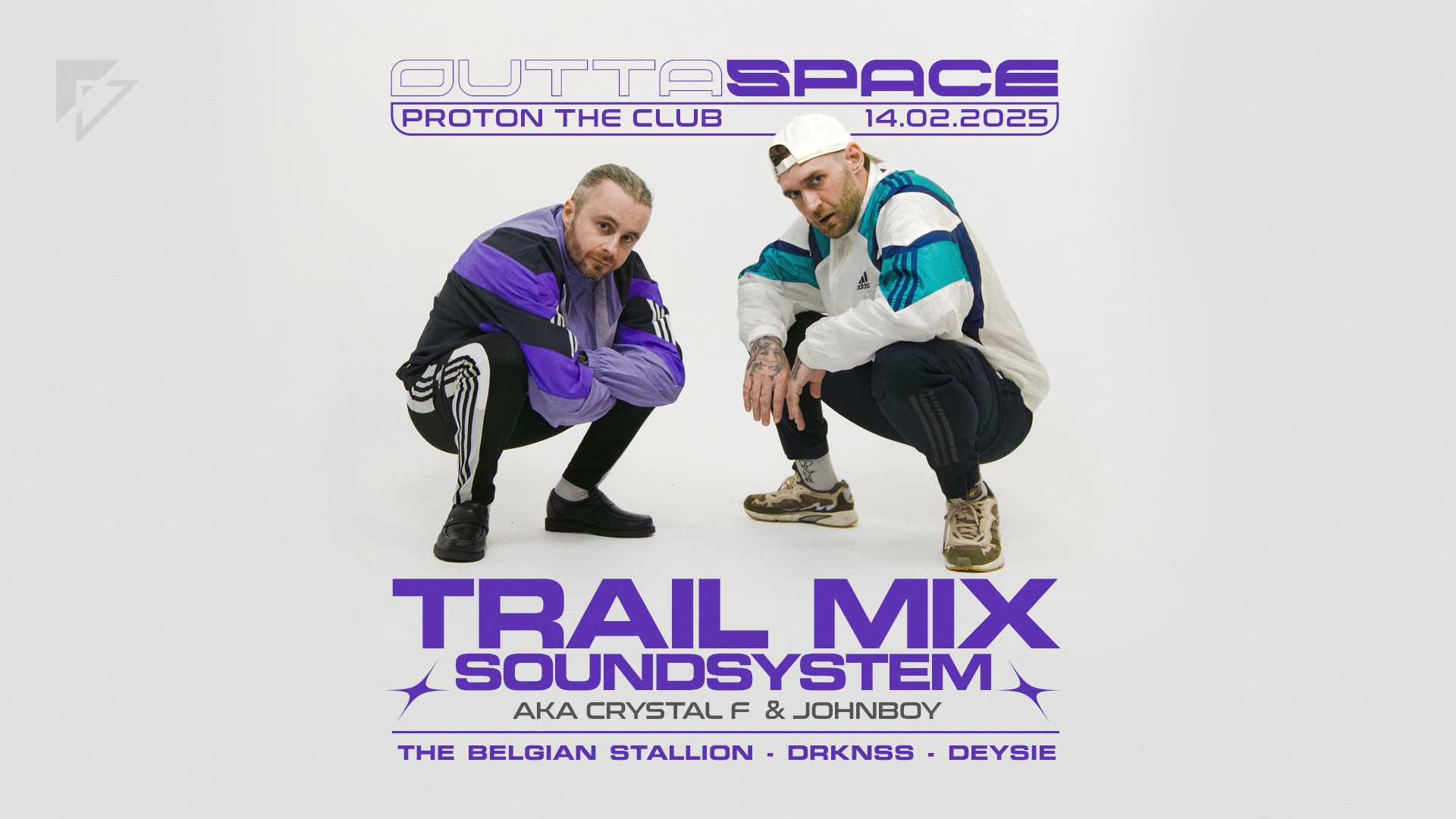 OUTTA SPACE pres. TRAIL MIX SOUNDSYSTEM (Crystal F & Johnboy) GENRE 🎵 TEKK & TRANCE 🔊 ◢ LINE UP: 🎧CRYSTAL F & JOHNBOY 🎧THE BELGIAN STALLION 🎧DRKNSS 🎧DEYSIE ◢ TICKETS: 》 🎫 Abendkasse ab 23 Uhr & online! 》 EINLASS AB 18 JAHREN! 》 VIP Tickets & Logen: reservierung@protontheclub.de ◢ EINLASS: 》 Alter: 18+ 》 Bei der Personenkontrolle ist ein Lichtbildausweis (z. B. Ausweis, Reisepass, Führerschein) zwingend erforderlich. Kein Ausweis, kein Einlass. 》 Online-Tickets garantieren euch keinen 100%tigen Eintritt. Das Management behält sich weiterhin das Recht vor, Personen den Zutritt zu verweigern, die die besondere Atmosphäre, die das Proton geschaffen hat, und die Sicherheit oder den Genuss unserer Gäste gefährden könnten. Dazu gehören Menschen, deren Verhalten, Einstellung sich negativ auf diese Stimmung auswirken würden. ▔▔▔▔▔▔▔▔▔▔▔▔▔▔▔▔▔▔ Artwork by Stuttart Graphics