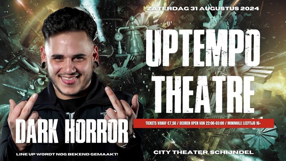 UPTEMPO THEATRE X THE DARK HORROR Eind augustus komt The Dark Horror naar het City Theater! Met zijn bekende nummers en dikke sets op de grootste festivals kun je deze avond niet missen! 💥 Haal snel je tickets want voor je het weet zijn ze al weg! De line up wordt nog bekend gemaakt 𝗛𝗶𝗲𝗿𝗼𝗻𝗱𝗲𝗿 𝗱𝗲 𝗶𝗻𝗳𝗼𝗿𝗺𝗮𝘁𝗶𝗲: Zaterdag 31 augustus 2024 Leeftijd is 16+ Deuren zijn open om 22:00 Tickets zijn online verkrijgbaar (www.citytheaterschijndel.nl) Geen 18 = Geen Alcohol!