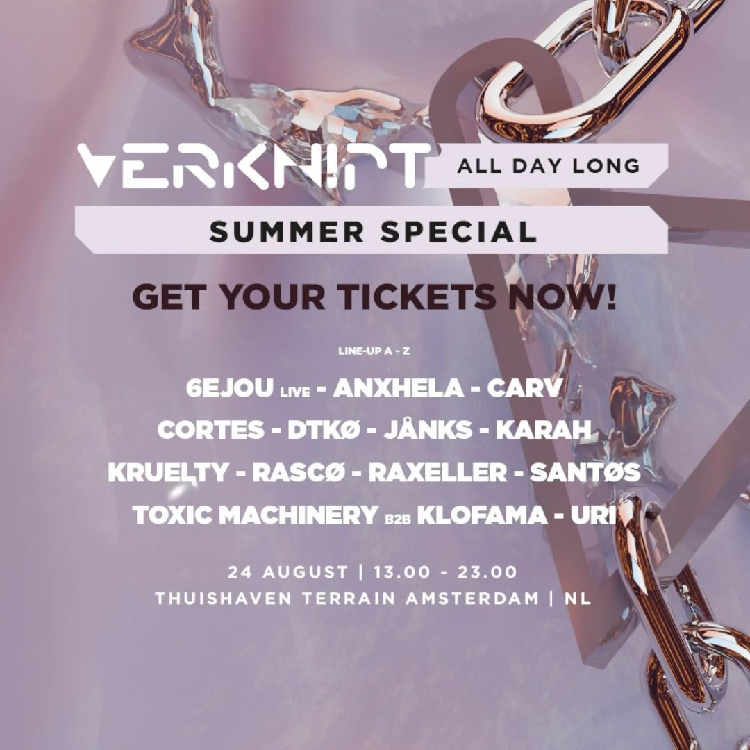 𝗧𝗛𝗜𝗦 𝗘𝗩𝗘𝗡𝗧 𝗜𝗦 𝗦𝗢𝗟𝗗 𝗢𝗨𝗧! 𝗩𝗲𝗿𝗸𝗻𝗶𝗽𝘁 𝗔𝗹𝗹 𝗗𝗮𝘆 𝗟𝗼𝗻𝗴 | 𝗦𝘂𝗺𝗺𝗲𝗿 𝗦𝗽𝗲𝗰𝗶𝗮𝗹 @ 𝗧𝗵𝘂𝗶𝘀𝗵𝗮𝘃𝗲𝗻 𝘁𝗲𝗿𝗿𝗮𝗶𝗻, 𝗔𝗺𝘀𝘁𝗲𝗿𝗱𝗮𝗺 Just when you thought your summer couldn’t get any better, we surprise you with a summer rave! On August 24th Verknipt will take over the Thuishaven terrain for a HARD rave with an outdoor & indoor stage! Let’s get together and celebrate our love for hard music! We received a lot of messages as to why we didn’t host a Verknipt event in August and that’s why we’re hosting this last-minute HARD rave for a lower price for our loyal ravers! 𝙊𝙥𝙚𝙣𝙞𝙣𝙜 𝙩𝙞𝙢𝙚𝙨: 13.00 - 23.00 Doors close at 20:00 (be on time!) __ 𝗧𝗶𝗺𝗲𝘁𝗮𝗯𝗹𝗲 𝗢𝘂𝘁𝗱𝗼𝗼𝗿 13.00 - 14.15 URI 14.15 - 15.30 RASCØ 15.30 - 16.45 Anxhela 16.45 - 18.00 CARV 18.00 - 19.15 Raxeller 19.15 - 20.30 Toxic Machinery b2b Klofama 20.30 - 21.45 KARAH 21.45 - 23.00 6EJOU Live 𝗜𝗻𝗱𝗼𝗼𝗿 15.00 - 17.00 CORTES 17.00 - 18.30 SANTØS 18.30 - 20.00 DTKØ 20.00 - 21.30 Jånks 21.30 - 23.00 Kruelty __ 𝗕𝗲𝘄𝗮𝗿𝗲 𝗼𝗳 𝘀𝗰𝗮𝗺𝗺𝗲𝗿𝘀! Tickets are only sold via our ticket provider Eventix, and can only be resold through TicketSwap. Because we work with sealed tickets, your ticket is not yet visible and therefore cannot be resold via any other platform. So be careful not to buy someone's PDF ticket through other channels, because this is most likely a SCAM! __ 18+ 𝘐𝘋 𝘳𝘦𝘲𝘶𝘪𝘳𝘦𝘥 𝘡𝘦𝘳𝘰 𝘛𝘰𝘭𝘦𝘳𝘢𝘯𝘤𝘦 𝘗𝘰𝘭𝘪𝘤𝘺 __ Follow us! ◥ Website | www.verknipt.org ◥ Instagram | www.instagram.com/verkniptevents ◥ TikTok | www.tiktok.com/@verkniptevents ◥ Youtube | www.youtube.com/c/VERKNIPTYOUTUBE ◥ Soundcloud | www.soundcloud.com/verknipt-events ◥ Spotify | http://bit.ly/SpotifyVerknipt ◥ WhatsApp Channel | https://whatsapp.com/channel/0029VaH0ZYf9Bb5qGnBc0v3b ◥ Facebook | www.facebook.com/verkniptevents