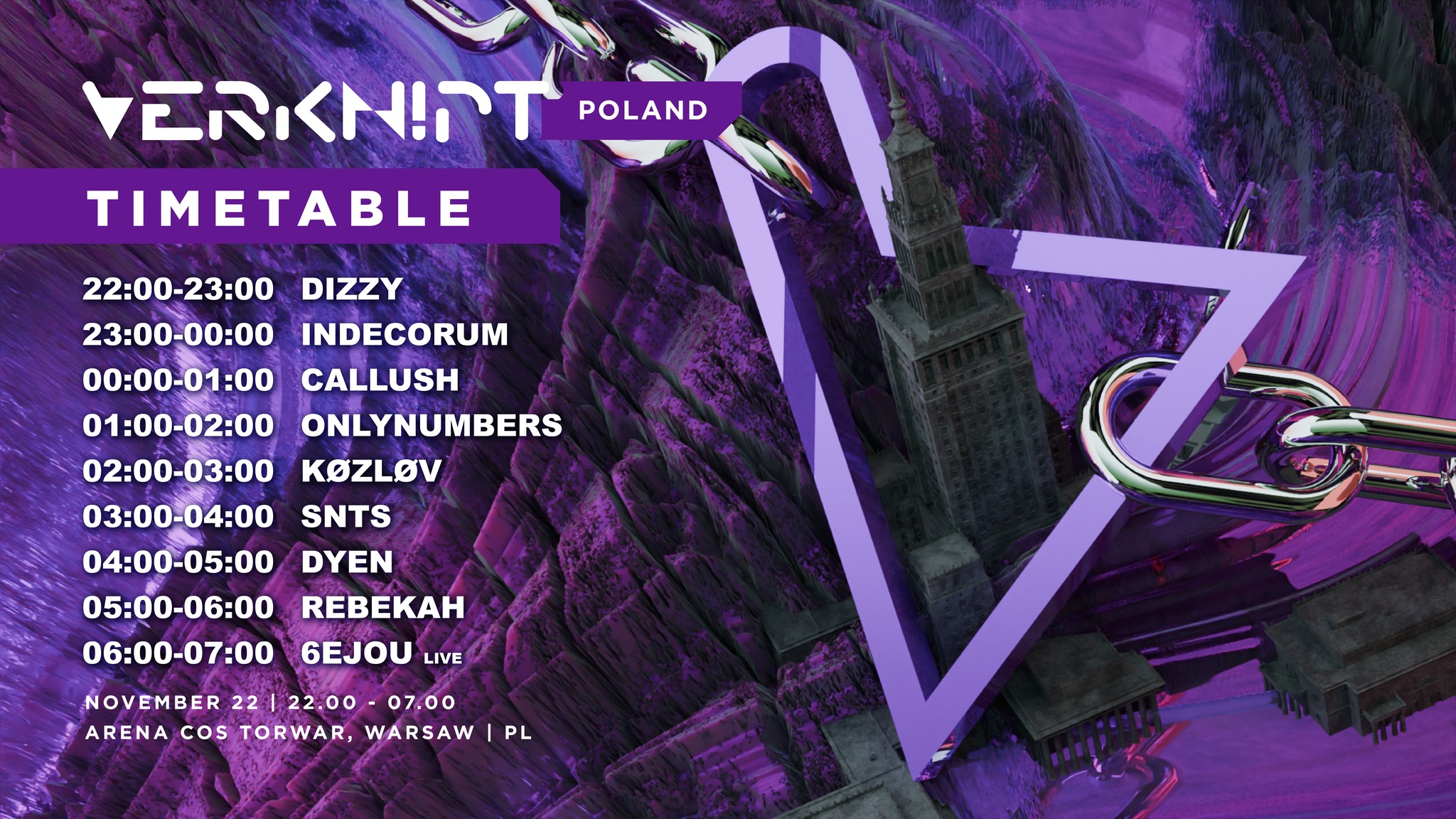 WE'RE BACK! 𝗩𝗲𝗿𝗸𝗻𝗶𝗽𝘁 𝗣𝗼𝗹𝗮𝗻𝗱: 𝗡𝗼𝘃𝗲𝗺𝗯𝗲𝗿 𝟮𝟮 🇵🇱❤️🔥 (EN) Our first rave in Poland was WILD & many of you kept messaging us to come back!😈 Good news: on November 22 we are bringing the next edition of Verknipt Poland to Arena COS Torwar in Warsaw! With these KILLER artists on the line-up and the usual crazy Verknipt show, the second edition promises to legendary... 🤯 𝗚𝗲𝘁 𝘆𝗼𝘂𝗿 𝘁𝗶𝗰𝗸𝗲𝘁𝘀 𝗻𝗼𝘄: https://eventix.shop/93b8k3fz (PL) Nasza pierwsza impreza w Polsce była DZIKA i wielu z was pisało do nas, abyśmy wrócili!😈 Dobre wieści: 22 listopada przynosimy kolejną edycję Verknipt Poland do Areny COS Torwar w Warszawie! Z tymi WSPANIAŁYMI artystami w line-upie i z szalonym show Verknipt, druga edycja zapowiada się legendarna…🤯 𝗞𝘂𝗽 𝗯𝗶𝗹𝗲𝘁𝘆 𝗷𝘂ż 𝘁𝗲𝗿𝗮𝘇: https://eventix.shop/93b8k3fz 𝙊𝙥𝙚𝙣𝙞𝙣𝙜 𝙩𝙞𝙢𝙚𝙨: 22.00 - 07.00 Doors close at 03.00 (be on time!) __ ⛓ 𝗧𝗶𝗺𝗲𝘁𝗮𝗯𝗹𝗲 22:00 - 23:00 DIZZY 23:00 - 00:00 INDECORUM 00:00 - 01:00 CALLUSH 01:00 - 02:00 ONLYNUMBERS 02:00 - 03:00 KØZLØV 03:00 - 04:00 SNTS 04:00 - 05:00 DYEN 05:00 - 06:00 REBEKAH 06:00 - 07:00 6EJOU Live __ 𝗕𝗲𝘄𝗮𝗿𝗲 𝗼𝗳 𝘀𝗰𝗮𝗺𝗺𝗲𝗿𝘀! Tickets are only sold via our ticket provider Eventix, and can only be resold through TicketSwap. Because we work with sealed tickets, your ticket is not yet visible and therefore cannot be resold via any other platform. So be careful not to buy someone's PDF ticket through other channels, because this is most likely a SCAM! __ 18+ 𝘐𝘋 𝘳𝘦𝘲𝘶𝘪𝘳𝘦𝘥 𝘡𝘦𝘳𝘰 𝘛𝘰𝘭𝘦𝘳𝘢𝘯𝘤𝘦 𝘗𝘰𝘭𝘪𝘤𝘺 __ Follow us! ◥ Website | www.verknipt.org ◥ TikTok | www.tiktok.com/@verkniptevents ◥ Instagram | www.instagram.com/verkniptevents ◥ Facebook | www.facebook.com/verkniptevents ◥ Soundcloud | www.soundcloud.com/verknipt-events ◥ Youtube | www.youtube.com/c/VERKNIPTYOUTUBE ◥ Spotify | http://bit.ly/SpotifyVerknipt