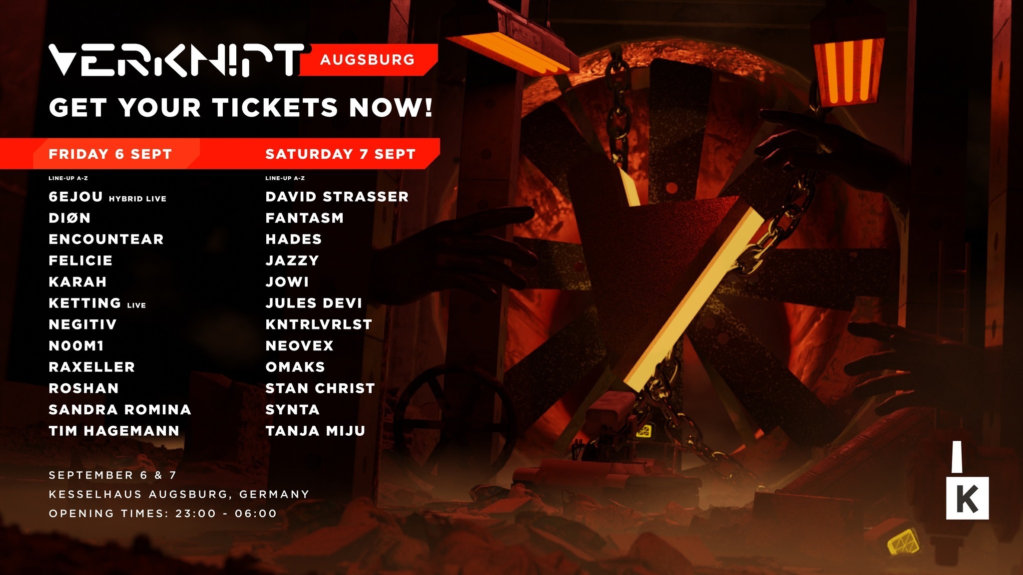 𝗚𝗲𝗿𝗺𝗮𝗻 𝗥𝗮𝘃𝗲𝗿𝘀, 𝗩𝗲𝗿𝗸𝗻𝗶𝗽𝘁 𝗶𝘀 𝗰𝗼𝗺𝗶𝗻𝗴 𝗯𝗮𝗰𝗸! ❤️🔥 (Scrollen Sie nach unten für Deutsch) And this time we conquer a different city with a 2-days long event: Augsburg. After our debut in Germany last year, we couldn't wait to return to the German rave scene; the love & energy you guys carry is contagious! At the Kesselhaus, we found the perfect industrial venue to match the style of our hard techno events! 𝗦𝗮𝘁𝘂𝗿𝗱𝗮𝘆 𝗶𝘀 𝗮𝗹𝗿𝗲𝗮𝗱𝘆 𝗦𝗢𝗟𝗗 𝗢𝗨𝗧! 𝗙𝗿𝗶𝗱𝗮𝘆 𝘁𝗶𝗰𝗸𝗲𝘁𝘀 𝗮𝗿𝗲 𝗮𝗹𝘀𝗼 𝗿𝘂𝗻𝗻𝗶𝗻𝗴 𝗳𝗮𝘀𝘁: https://eventix.shop/csjagemt We're bringing everything Verknipt is known for: our iconic lasershow, crazy visuals, the HARDEST artists & more! This weekend is going to be mind-blowing. __ 𝗚𝗲𝗿𝗺𝗮𝗻 𝗥𝗮𝘃𝗲𝗿𝘀, 𝗩𝗲𝗿𝗸𝗻𝗶𝗽𝘁 𝗶𝘀𝘁 𝘇𝘂𝗿ü𝗰𝗸! ❤️🔥 Und dieses Mal erobern wir die nächste Stadt mit einem 2-tägigen Event: Augsburg. Nach unserem Debüt in Deutschland im letzten Jahr, konnten wir es kaum erwarten, in die deutsche Rave-Szene zurückzukehren; die Liebe und Energie, die ihr in euch tragt, ist ansteckend! Mit dem Kesselhaus haben wir das perfekte Warehouse gefunden, das zum Stil unserer harten Techno-Events passt! 𝗗𝗲𝗿 𝗦𝗮𝗺𝘀𝘁𝗮𝗴 𝗶𝘀𝘁 𝗯𝗲𝗿𝗲𝗶𝘁𝘀 𝗔𝗨𝗦𝗩𝗘𝗥𝗞𝗔𝗨𝗙𝗧! 𝗙ü𝗿 𝗱𝗲𝗻 𝗙𝗿𝗲𝗶𝘁𝗮𝗴 𝗴𝗶𝗯𝘁 𝗲𝘀 𝗻𝘂𝗿 𝗻𝗼𝗰𝗵 𝗲𝗶𝗻𝗲 𝗴𝗲𝗿𝗶𝗻𝗴𝗲 𝗔𝗻𝘇𝗮𝗵𝗹 𝗧𝗶𝗰𝗸𝗲𝘁𝘀: https://eventix.shop/csjagemt Wir bringen natürlich wieder alles mit, wofür Verknipt bekannt ist: unsere kultige Lasershow, verrückte Visuals, die härtesten Artists & mehr! Dieses Wochenende wird mind-blowing. __ ⛓ 𝗟𝗶𝗻𝗲-𝘂𝗽 𝗙𝗿𝗶𝗱𝗮𝘆 𝟲 𝗦𝗲𝗽𝘁 6EJOU hybrid live DIØN Encountear Felicie KARAH KETTING Live Negitiv N00M1 Raxeller Roshan Sandra Romina Tim Hagemann ⛓ 𝗟𝗶𝗻𝗲-𝘂𝗽 𝗦𝗮𝘁𝘂𝗿𝗱𝗮𝘆 𝟳 𝗦𝗲𝗽𝘁 David Strasser Fantasm Hades Jazzy JOWI Jules Devi KNTRLVRLST Neovex Omaks Stan Christ SYNTA Tanja Miju __ 𝗕𝗲𝘄𝗮𝗿𝗲 𝗼𝗳 𝘀𝗰𝗮𝗺𝗺𝗲𝗿𝘀! Tickets are only sold via our ticket provider Eventix, and can ONLY be resold through TicketSwap. We work with Sealed Tickets, which means that your tickets will not be visible until the week of the event, you will get a notification via email that your tickets can be downloaded. We do this to give scammers as little chance as possible! So be careful not to buy someone's PDF ticket through other channels, because this is most likely a SCAM! 𝗪𝗮𝗿𝗻𝘂𝗻𝗴 𝘃𝗼𝗿 𝗦𝗰𝗮𝗺𝗺𝗲𝗿𝗻! Tickets werden nur über unseren offiziellen Ticketanbieter Eventix verkauft und können nur über TicketSwap weiterverkauft werden. Wir arbeiten mit versiegelten Tickets, was bedeutet, dass eure Tickets erst in der Woche der Veranstaltung heruntergeladen werden können. Ihr erhalter eine E-Mail-Benachrichtigung, sobald eure Tickets zum Download bereitstehen. Das machen wir, um Betrügenden so wenig Chancen wie möglich zu geben! Bitte seid also vorsichtig, wenn ihr ein PDF-Ticket von jemandem über andere Kanäle kaufen, denn das ist höchstwahrscheinlich ein SCAM! __ 18+ 𝘐𝘋 𝘳𝘦𝘲𝘶𝘪𝘳𝘦𝘥 / 18+ 𝘗𝘦𝘳𝘴𝘰𝘯𝘢𝘭𝘢𝘶𝘴𝘸𝘦𝘪𝘴 𝘯𝘰𝘵𝘸𝘦𝘯𝘥𝘪𝘨 𝘡𝘦𝘳𝘰 𝘛𝘰𝘭𝘦𝘳𝘢𝘯𝘤𝘦 𝘗𝘰𝘭𝘪𝘤𝘺 / 𝘕𝘶𝘭𝘭 𝘛𝘰𝘭𝘦𝘳𝘢𝘯𝘻 𝘗𝘰𝘭𝘪𝘵𝘪𝘬 __ Follow us! ◥ Website | www.verknipt.org ◥ Instagram | www.instagram.com/verkniptevents ◥ TikTok | www.tiktok.com/@verkniptevents ◥ Youtube | www.youtube.com/c/VERKNIPTYOUTUBE ◥ Soundcloud | www.soundcloud.com/verknipt-events ◥ Spotify | http://bit.ly/SpotifyVerknipt ◥ WhatsApp Channel | https://whatsapp.com/channel/0029VaH0ZYf9Bb5qGnBc0v3b ◥ Facebook | www.facebook.com/verkniptevents