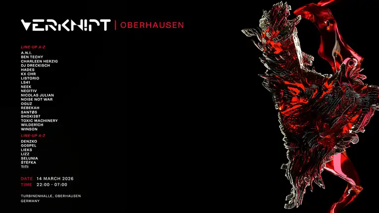 VERKNIPT OBERHAUSEN - SATURDAYOrganized by Verknipt,A.N.I. . Ben Techy . Charleen Herzig . DENZKO . DJ Dreckisch . GO$PEL . HADES . KX CHR . LIEKS . LS41 . Listorio . Lizz . NEEK . Nicolas Julian . Noise Not War . OGUZ . Rebekah . Santøs . Selunia . Shoki287 . Toxic Machinery . Wilderích . Winson . negitiv . ŚTÈFKATITI . |