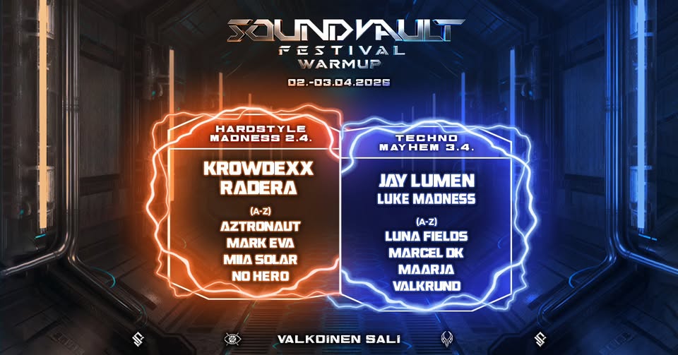 SOUNDVAULT FESTIVAL WARMUP - FRIDAYJay Lumen . Luke Madness . Luna Fields . Maarja . Marcel DK . Valkrund . |