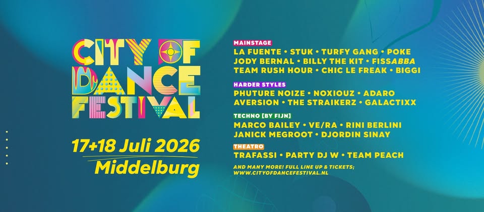 CITY OF DANCE FESTIVALAdaro . Aversion . BAZUR . Back To The Disco . Back To The House Classics . Bass Chaserz . Biggi & Elton Jonathan . Billy the Kit . Chic Le Freak . DESTRØY . DJ E-Volution . DJ Je Moeder . DJ Mikey . Die Ene Sjors . Djordin Sinay . FissABBAxs . Galactixx . Gijs van Belle . H4ZEL . Janick Megroot . Jody Bernal . La Fuente . MC Synergy . Marco Bailey . Noxiouz . Party DJ W . Patjoo . Phuture Noize . Poke . Potato . Reggae Hour . Rini Berlini . STUK . TRØJ . Team Peach . Team Rush Hour . The Straikerz . Thomas & Thomas . Trafassi . Turfy Gang . VE/RA . Wesley N . |